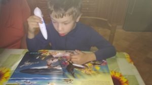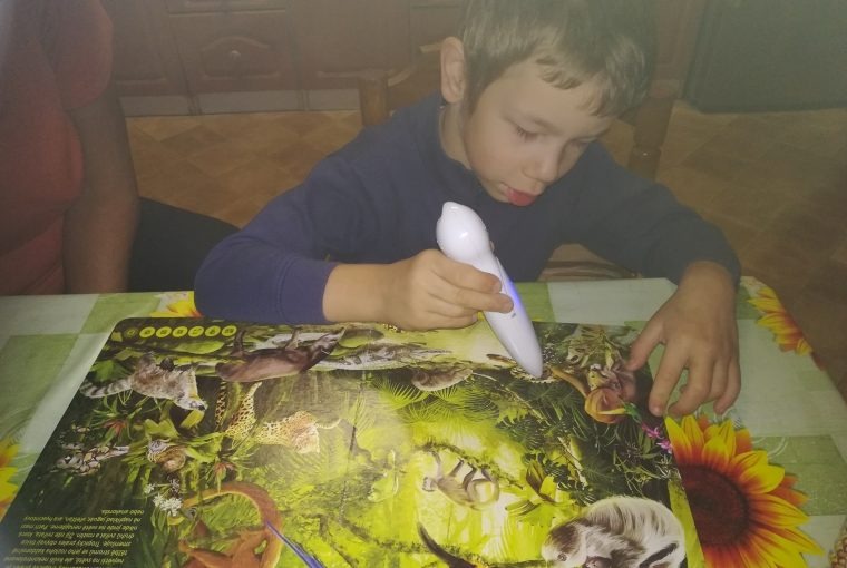 „Náš Joe má půjčenou knihu Svět zvířat. Je mu 7 let, má rád zvířata, proto si tuto knihu vybral. Ale asi nejvíc ho zaujala ta mluvící tužka