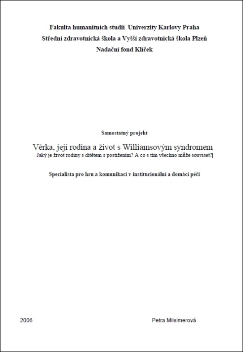 V roce 2006 zpracovala paní Petra Milsimerová na Fakultě humanitních studií samostatný projekt na téma: Věrka, její rodina a život s Williamsovým syndromem. S jejím svolením zveřejňujeme zde.