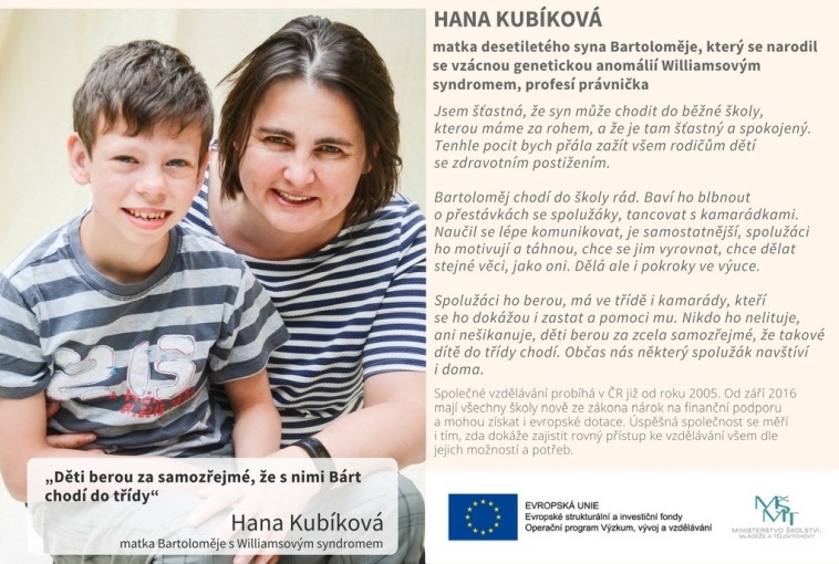 „Jsem šťastná, že syn může chodit do běžné školy, kterou máme za rohem, a že je tam spokojený. Tenhle pocit bych přála zažít všem rodičům dětí se zdravotním postižením,“ říká Hana Kubíková, matka desetiletého Bartoloměje, který se narodil s chromozomální odchylkou, tzv. Williamsovým syndromem, a již třetím rokem úspěšně navštěvuje běžnou základní školu Sokolovská v Liberci. „Jsem ráda, že se nám se školou podařilo získat finance na takovou míru podpory, která umožňuje, aby se Bárt vzdělával v běžném vzdělávacím proudu, a to tak, aby to bylo přínosné pro všechny,“ dodává Hana Kubíková, profesí právnička na personálním odboru Ministerstva pro místní rozvoj. „ Těší mě, že náš příklad může být inspirací i pro další rodiče. V našem spolku Willík (spolek sdružující rodiny dětí s Williamsovým syndromem v České republice) je řada dětí, které jsou na tom mentálně ještě mnohem lépe než Bartoloměj, a jejich rodiče, díky našemu příkladu, začínají uvažovat o tom, že zkusí běžnou základní školu. Pevně věřím, že díky nově nastaveným pravidlům se podobné příběhy budou vyskytovat stále častěji, “ uzavírá s optimismem v hlase Hana Kubíková.